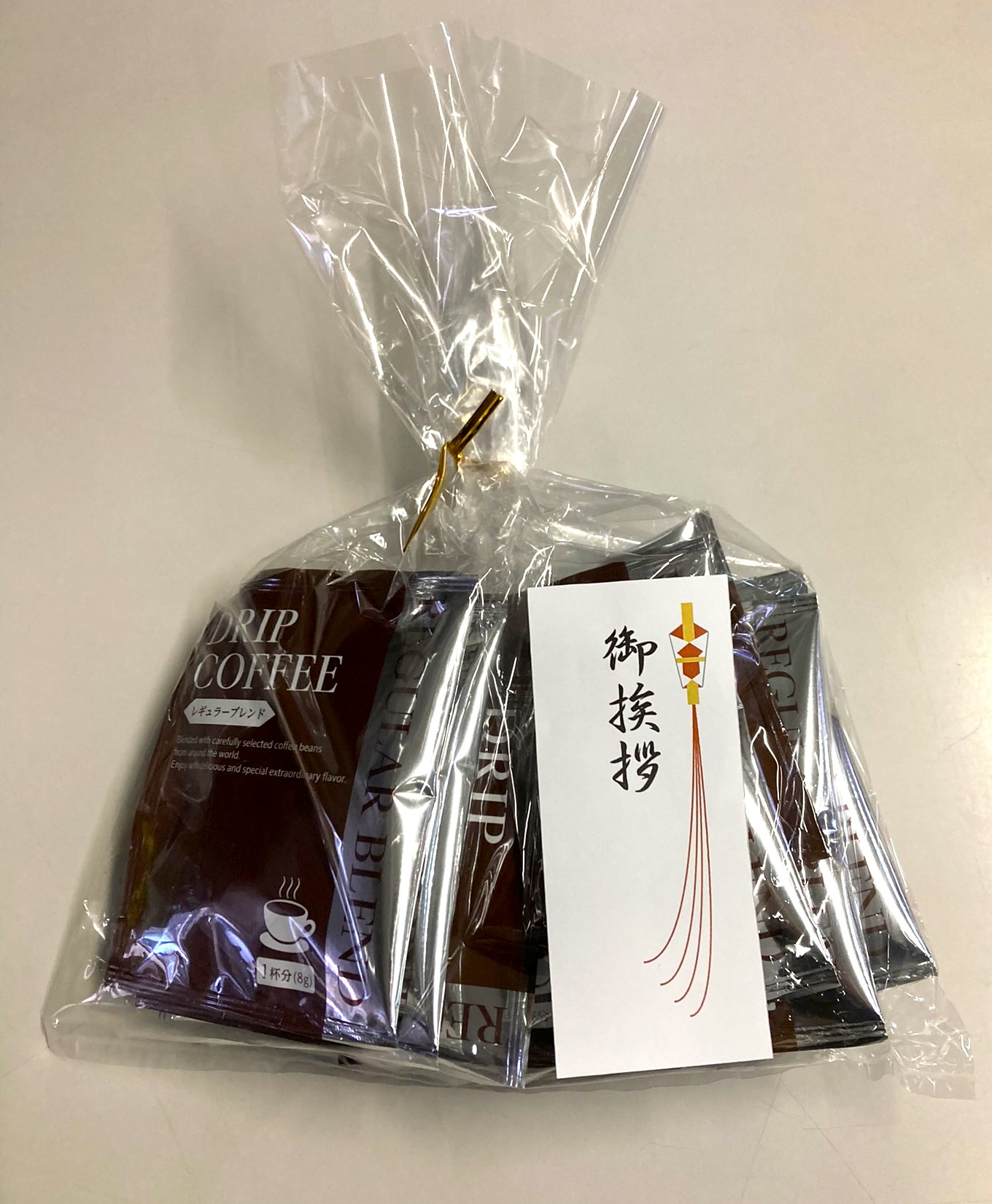 便利な個包装タイプでおいしいコーヒーが1分でできます。 参加賞やニアピン賞に最適(包装はできませんのでラベルを貼り付け発送します。|x|【外装の仕様】 PP袋入り|x|【内容】 レギュラーコーヒー|x|引っ越しご挨拶品も対応可能です。